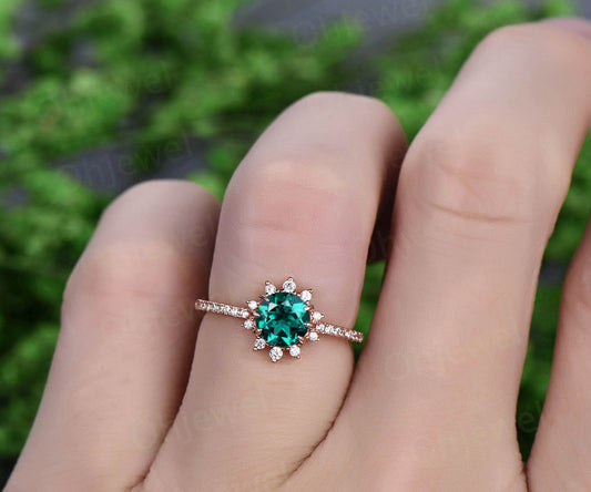 Green emerald engagement ring rose gold 14K/18K moissanite halo ring emerald ring vintage may birthstone unique wedding promise bridal ring