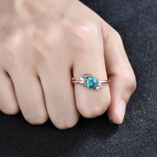 Hexagon cut Turquoise ring rose gold for women vintage unique Turquoise engagement ring cluster marquise diamond wedding promise ring gift