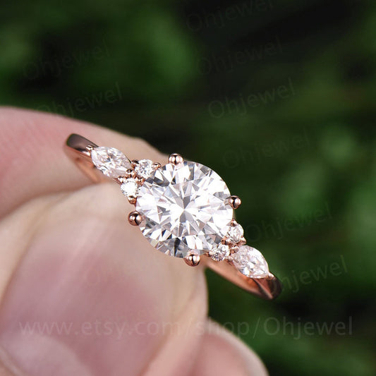 Dainty round cut moissanite ring gold vintage unique moissanite engagement ring 14k rose gold 7 stone diamond bridal wedding ring for women