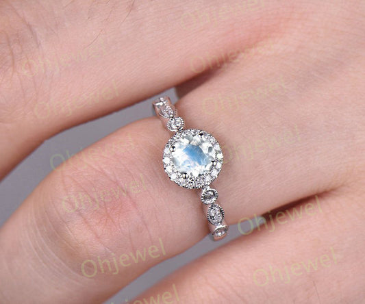 0.5ct blue moonstone engagement ring white gold 14K/18K moissanite halo wedding band june birthstone ring stackable promise moonstone ring