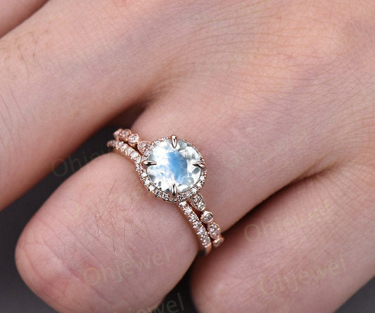 Moonstone engagement ring set rose gold 14K/18K moonstone ring gold set moissanite halo wedding ring band June birthstone ring promise ring
