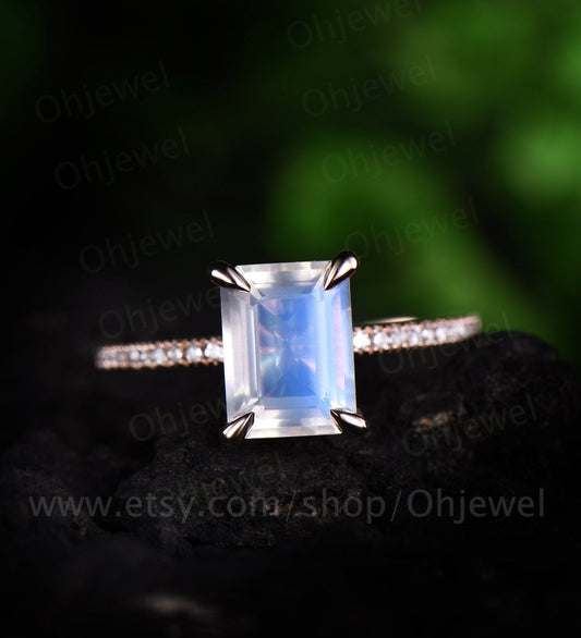 6x8mm emerald cut moonstone engagement ring vintage rose gold Milgrain ring five stone diamond ring 8 prong moon ring unique bridal ring