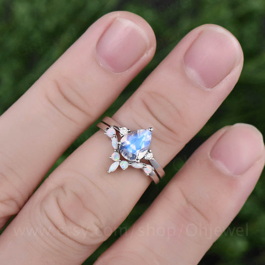 Marquise opal ring moissanite ring vintage unique three stone engagement ring 2pcs pear moonstone engagement ring set white gold jewelry