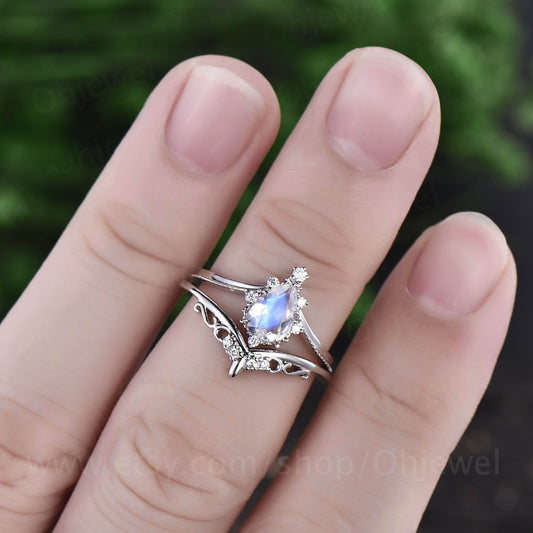 5x7mm pear moonstone ring set unique vintage 2pcs moonstone engagement ring set white gold moissanite ring June birthstone ring bridal set