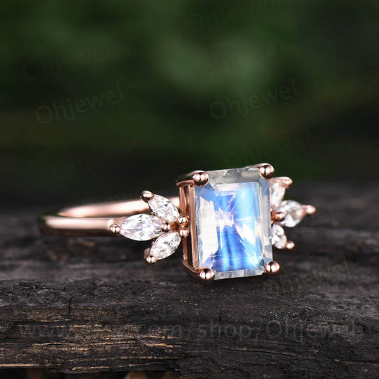 Vintage moonstone engagement ring for women unique rose gold wedding ring emerald cut bridal ring marquise moissanite ring gold jewelry gift