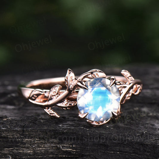 Vintage moonstone ring gold silver for women solitaire moonstone engagement ring leaf flower ring antique dainty custom ring promise ring