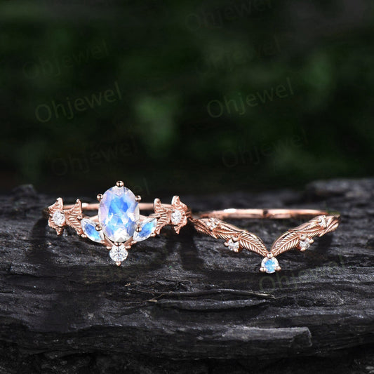 Twig oval cut moonstone engagement ring set 14k rose gold branch leaf nature inspired diamond ring art deco unique wedding ring set women