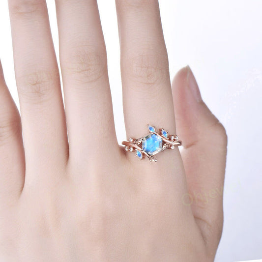 Vintage Hexagon cut moonstone engagement ring art deco nature inspired diamond ring women leaf rose gold branch promise wedding ring gift
