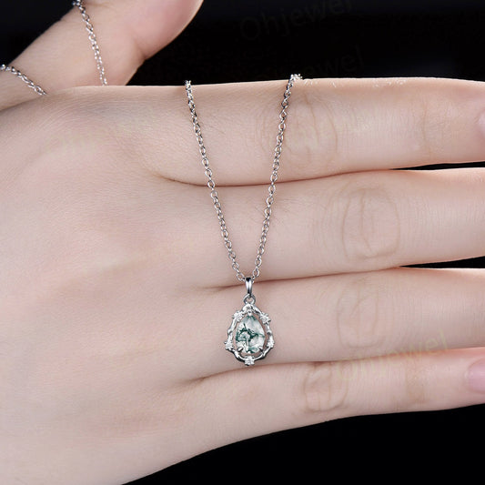 Pear green moss agate necklace vintage halo cluster milgrain moon diamond Pendant art deco 14k rose gold women antique anniversary gift her