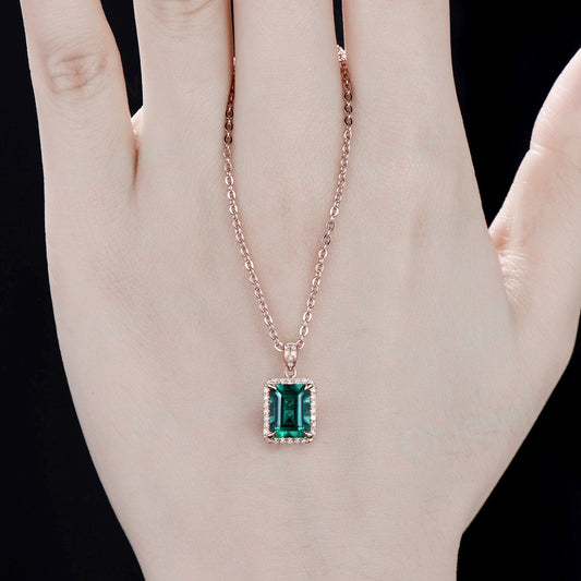 3ct emerald cut green emerald necklace solid 14k yellow gold unique halo diamond Pendant women Personalized antique anniversary gift her