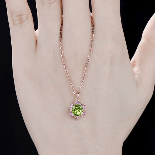 Round peridot necklace vintage milgrain floral purple amethyst Pendant women solid 14k rose gold August birthstone anniversary gift her