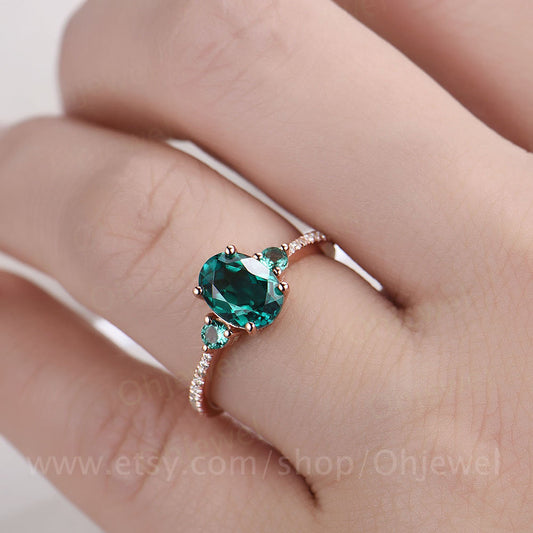 Three stone moissanite ring oval cut emerald engagement ring rose gold emerald ring vintage May birthstone women wedding bridal ring gift