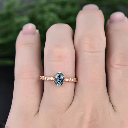 Oval cut Alexandrite ring rose gold vintage Alexandrite engagement ring for women June birthstone jewelry art deco moissanite bridal ring