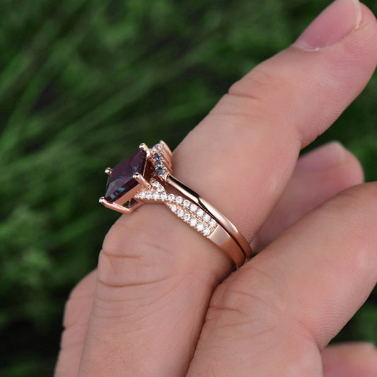 Princess cut Alexandrite rose gold ring unique 2pcs color change Alexandrite engagement ring set vintage moissanite ring set jewelry gift