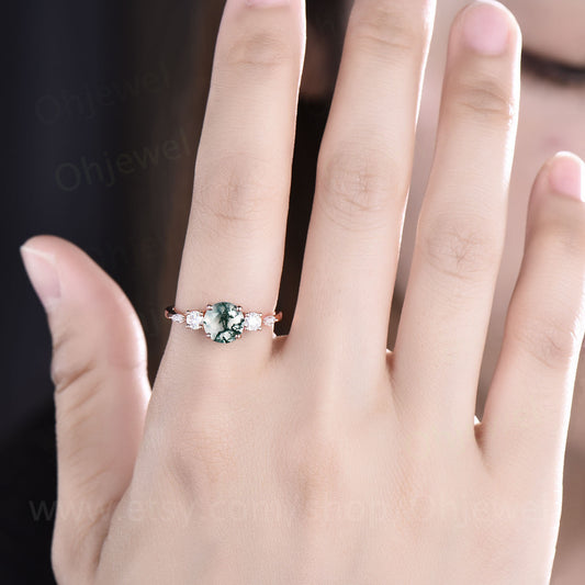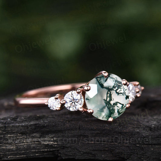 Round moss agate ring for women unique vintage moss agate engagement ring five stone rose gold moissanite ring custom ring dainty promise