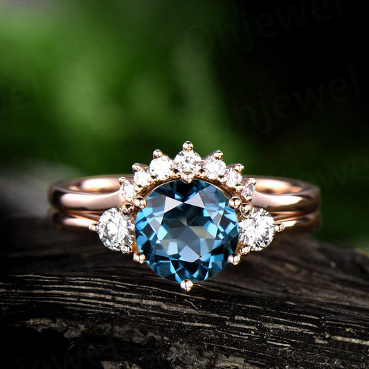 Vintage unique engagement ring 2pcs London blue topaz engagement ring set rose gold moissanite ring topaz wedding band wedding bridal set