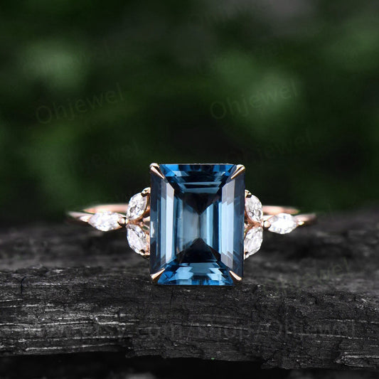 Emerald cut London blue topaz engagement ring rose gold art deco unique engagement ring marquise cut diamond ring promise ring for her gifts