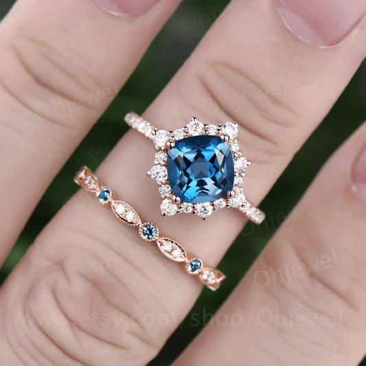 London blue topaz ring unique engagement ring set Cushion cut unique rose gold engagement ring antique moissanite ring bridal ring set women