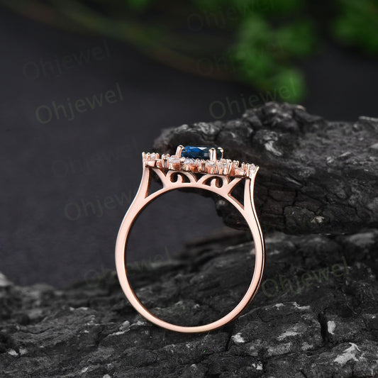 Vintage pear shaped London blue topaz engagement ring set rose gold cluster diamond ring dainty unique bridal wedding ring set women gift