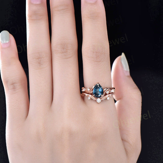 Twig pear shaped London blue topaz engagement ring five stone vintage branch leaf rose gold nature inspired diamond wedding ring set women