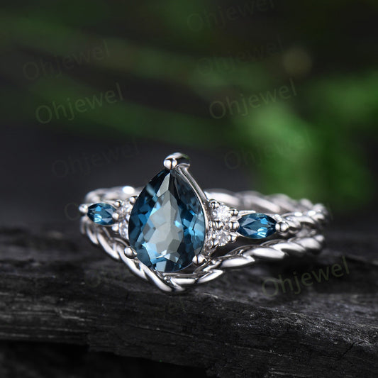 Vintage pear London blue topaz ring white gold twisted unique engagement ring women gemstone moisanite stacking bridal wedding set