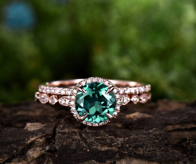 1.3 ct round cut emerald engagement ring set rose gold 14K/18K halo moissanite curved wedding band macthing stacking promise ring bridal set