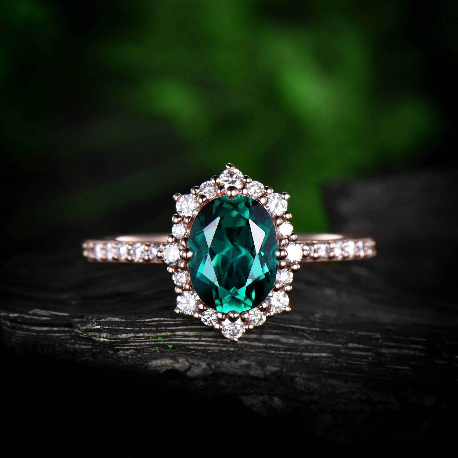 1.3ct emerald ring vintage halo moissanite ring emerald engagement ring solid rose gold anniversary birthday gift for women