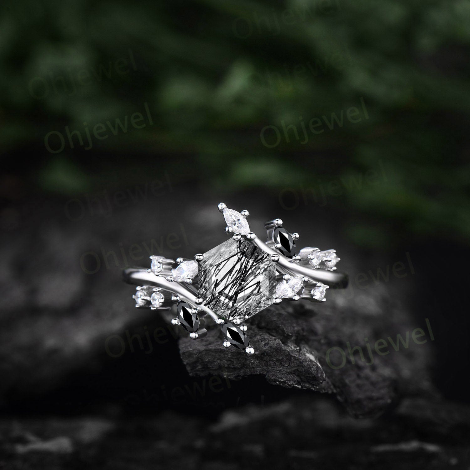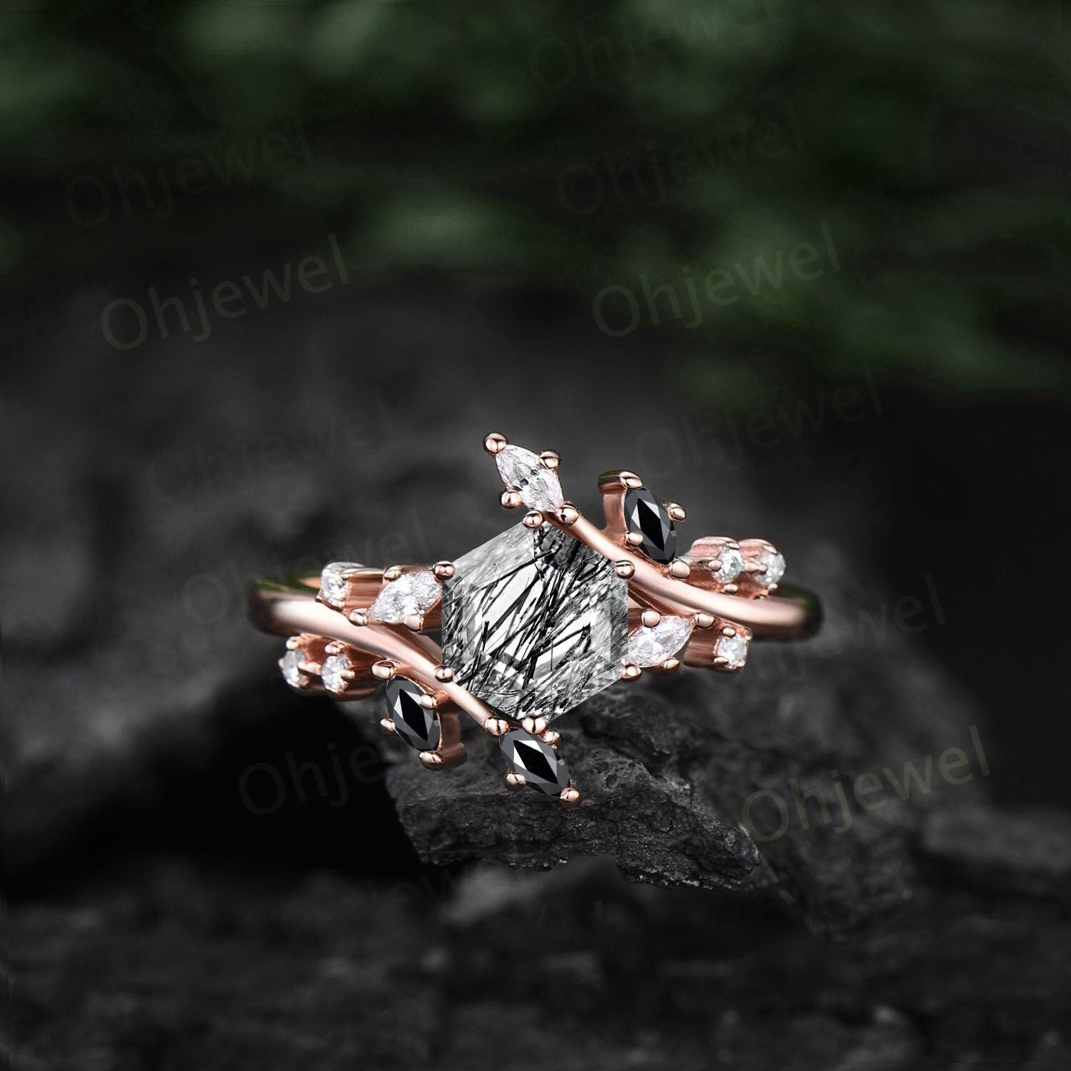 1ct Hexagon cut black rutilated quartz engagement ring solid 14k rose gold dainty maquise cut diamond moissanite anniversary ring women gift