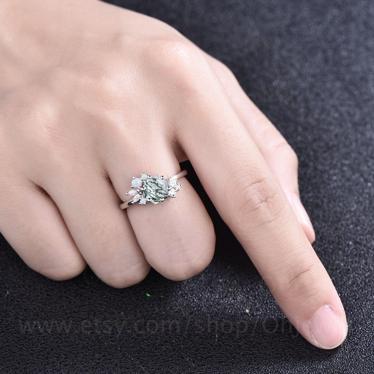 1ct Hexagon cut green moss agate ring solid 14k white gold sterling silver cluster opal ring marquise cut diamond engagement ring women gift