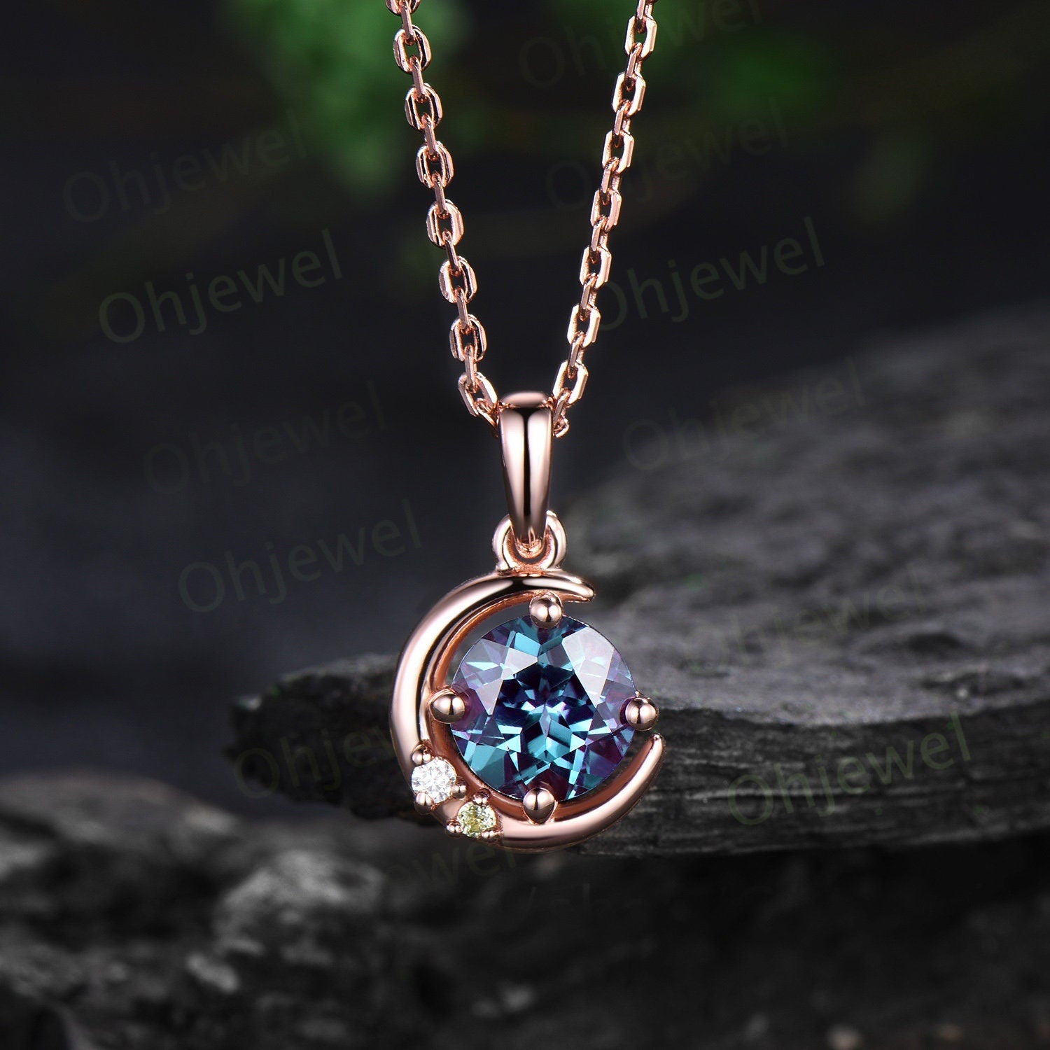 1ct round cut alexandrite necklace solid 14k rose gold antique moon three stone peridot moissanite Pendant women birthday anniversary gift