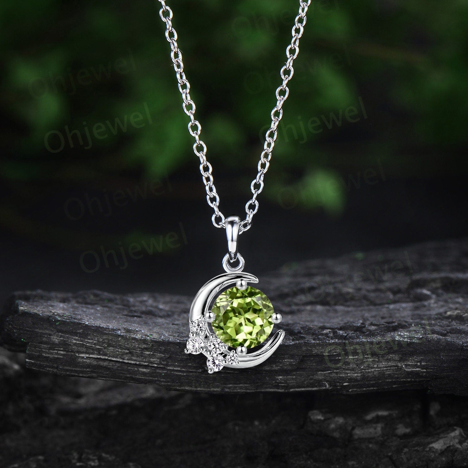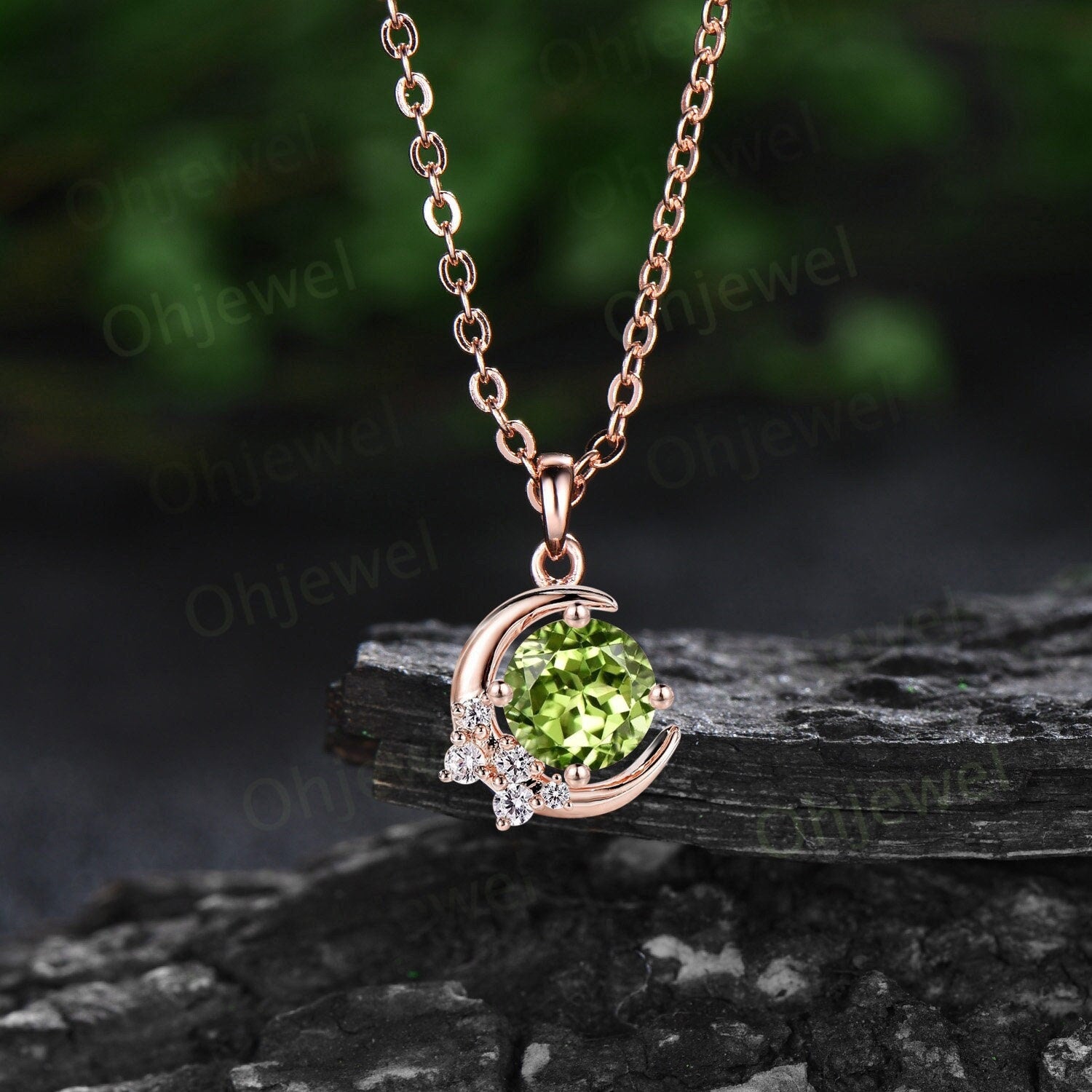1ct Round peridot necklace solid 14k rose gold unique moon necklace cluster moissanite Pendant women anniversary gift August birthstone