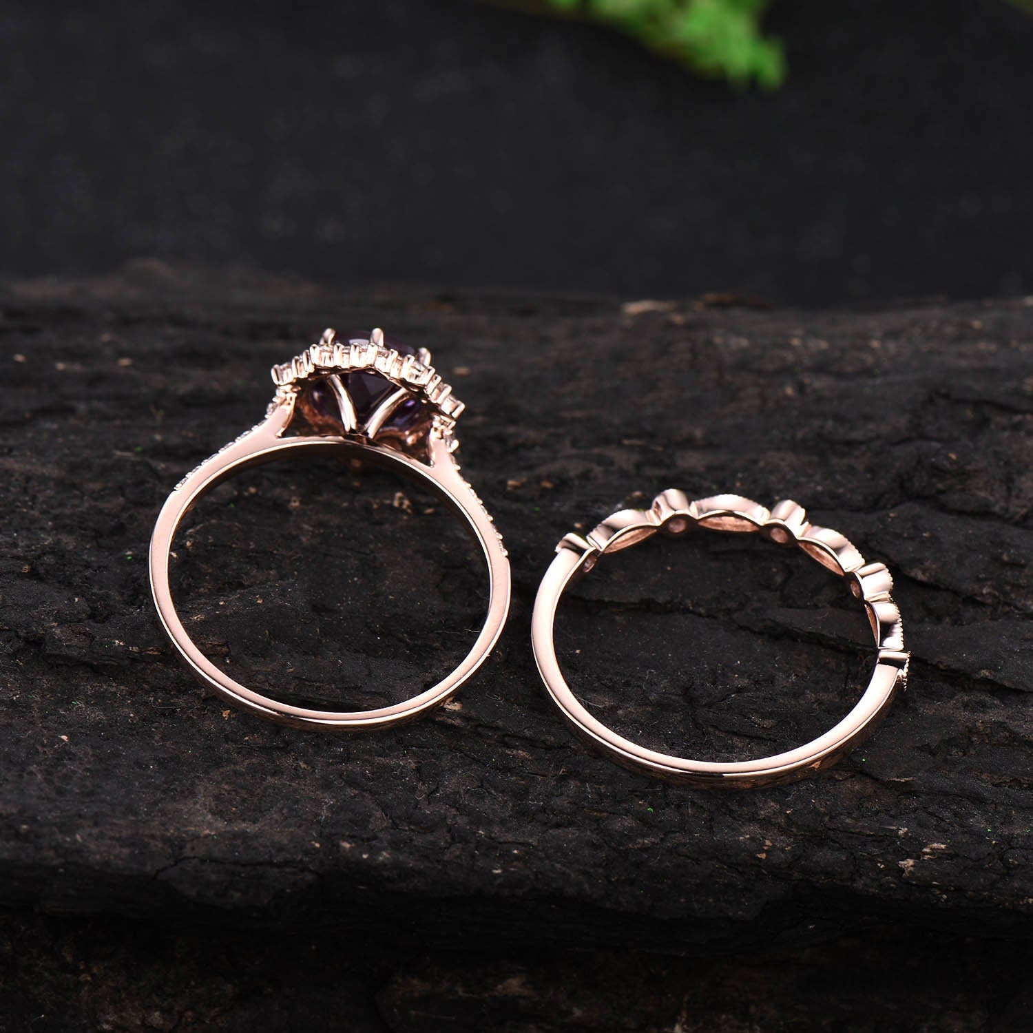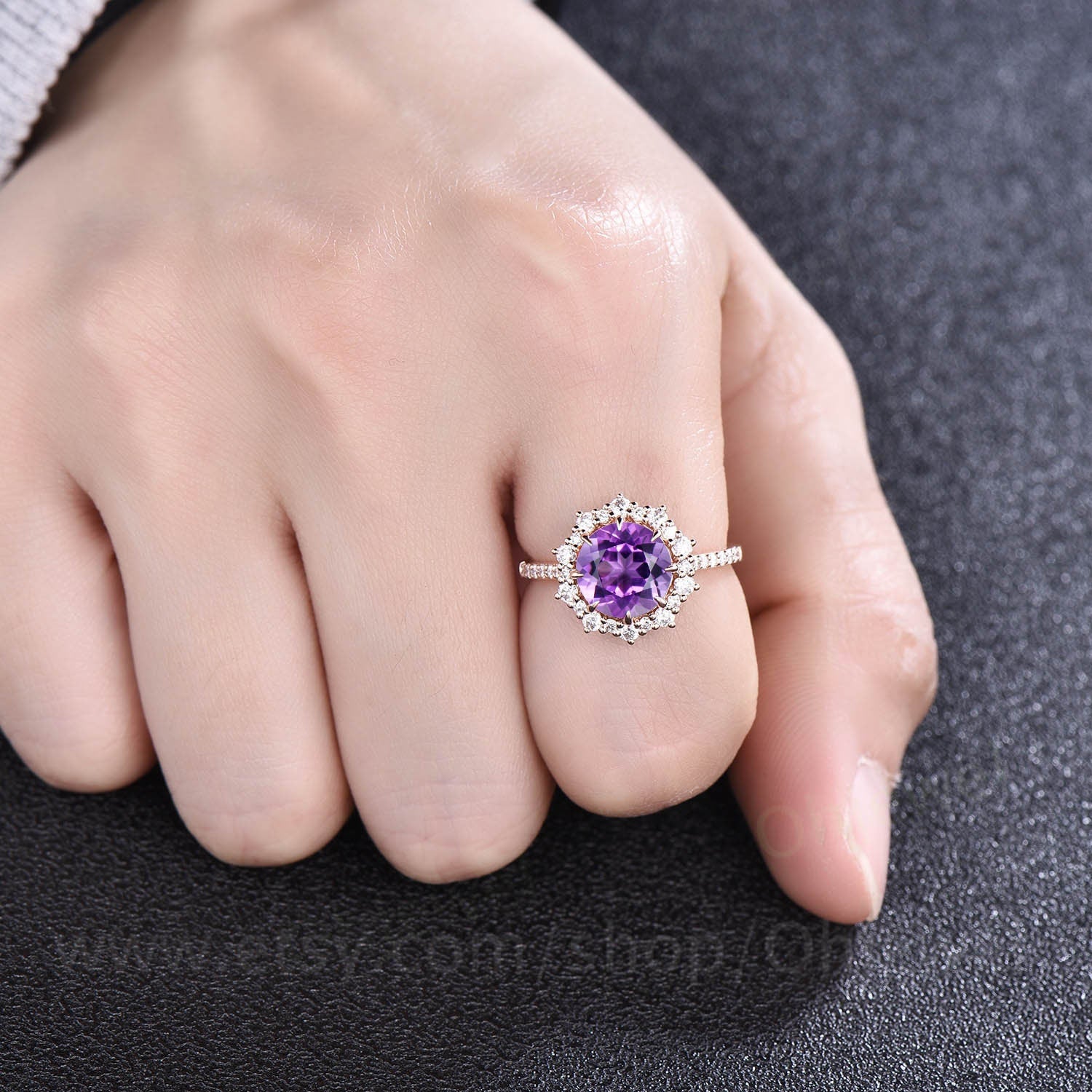 2ct round Amethyst ring rose gold vintage unique Amethyst engagement ring set halo snowdrift moissanite bridal anniversary ring set women