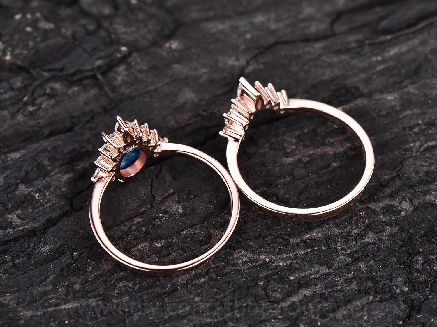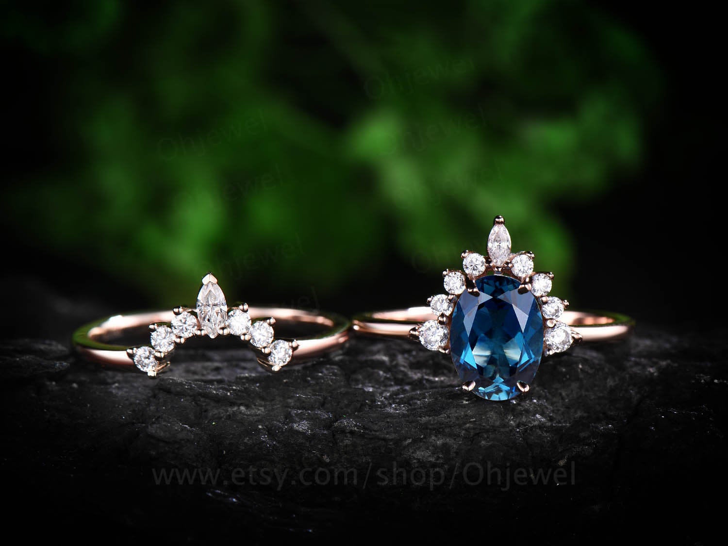 2pcs cluster crown art deco moissanite ring band oval London blue topaz engagement ring set rose gold vintage topaz wedding bridal ring set