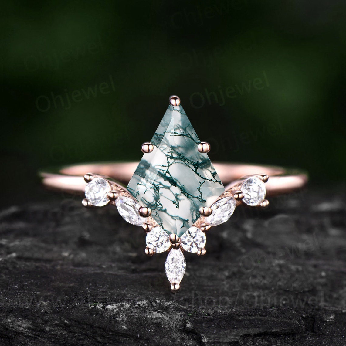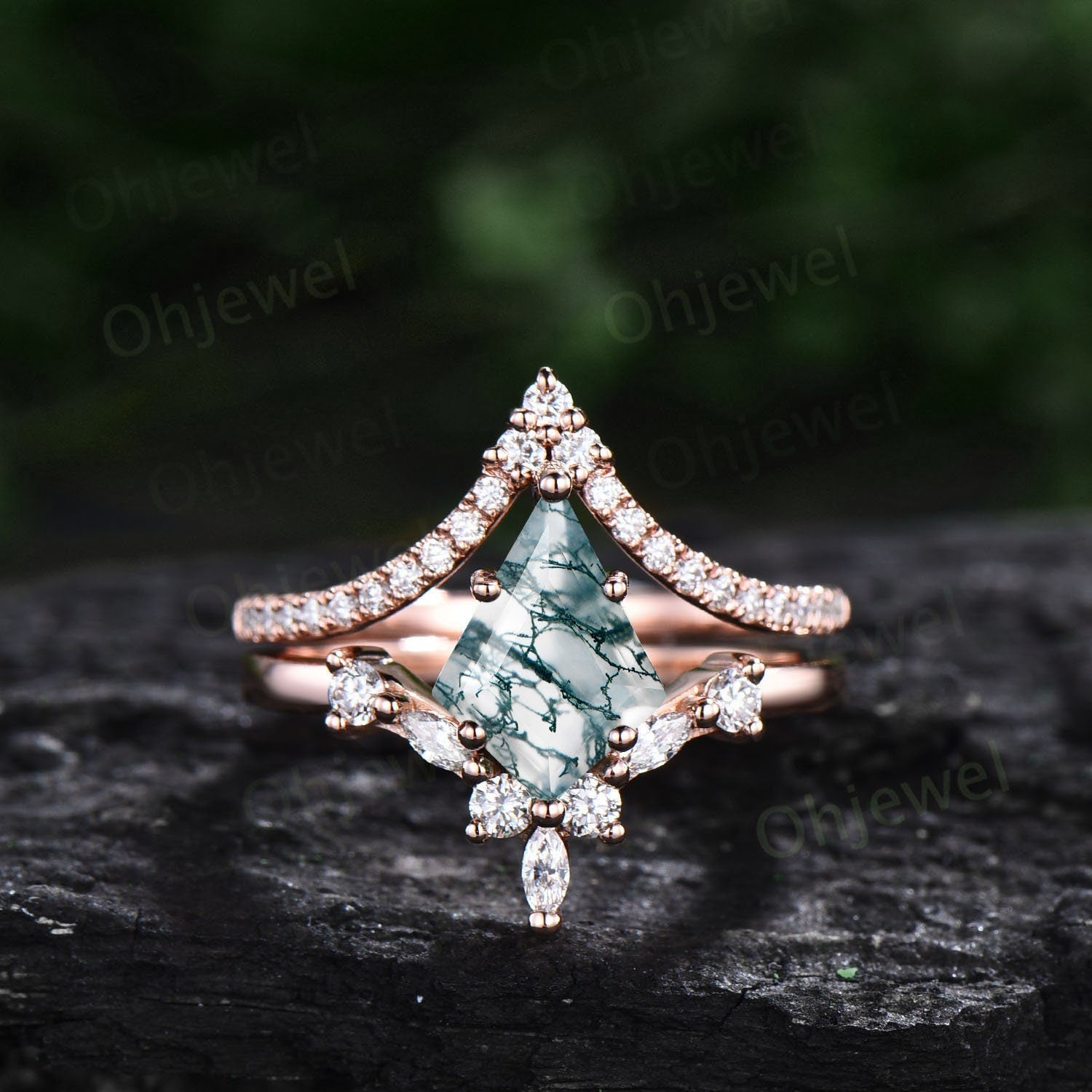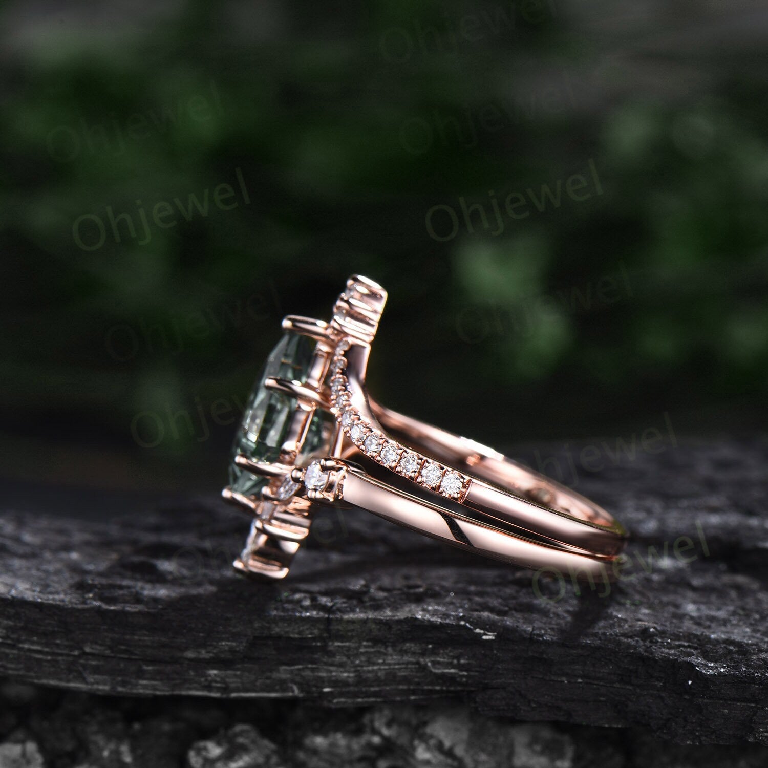 6 prong kite cut green moss agate engagement ring set 14k rose gold marquise diamond vintage unique wedding promise anniversary ring women
