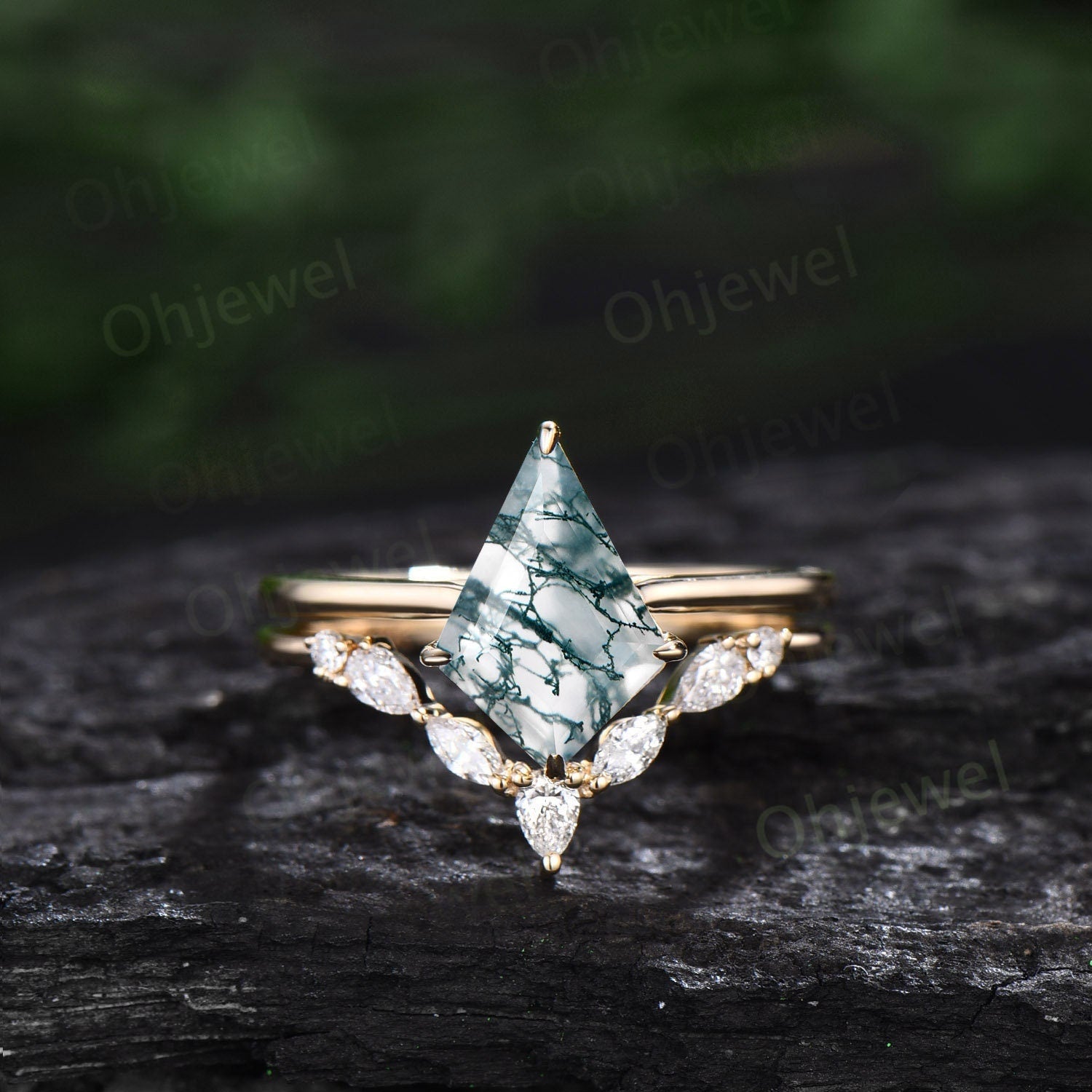 7x10mm kite cut green moss agate ring 14k yellow gold unique Solitaire engagement ring set for women Minimalist moissanite wedding ring band