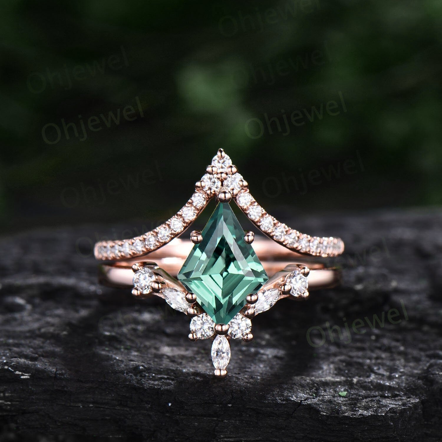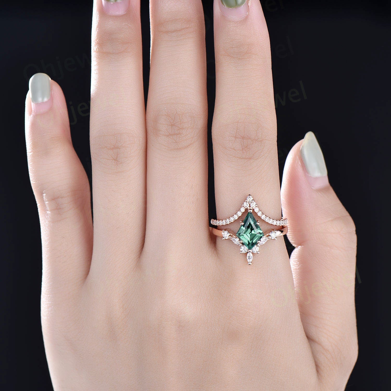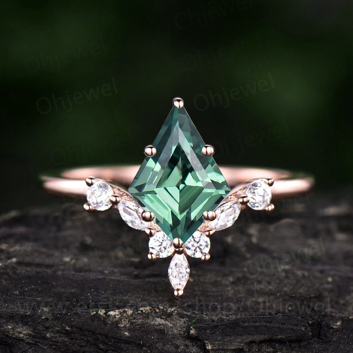 7x10mm kite cut teal green sapphire engagement ring set 14k rose gold 6 prong marquise cut diamond wedding promise anniversary ring women