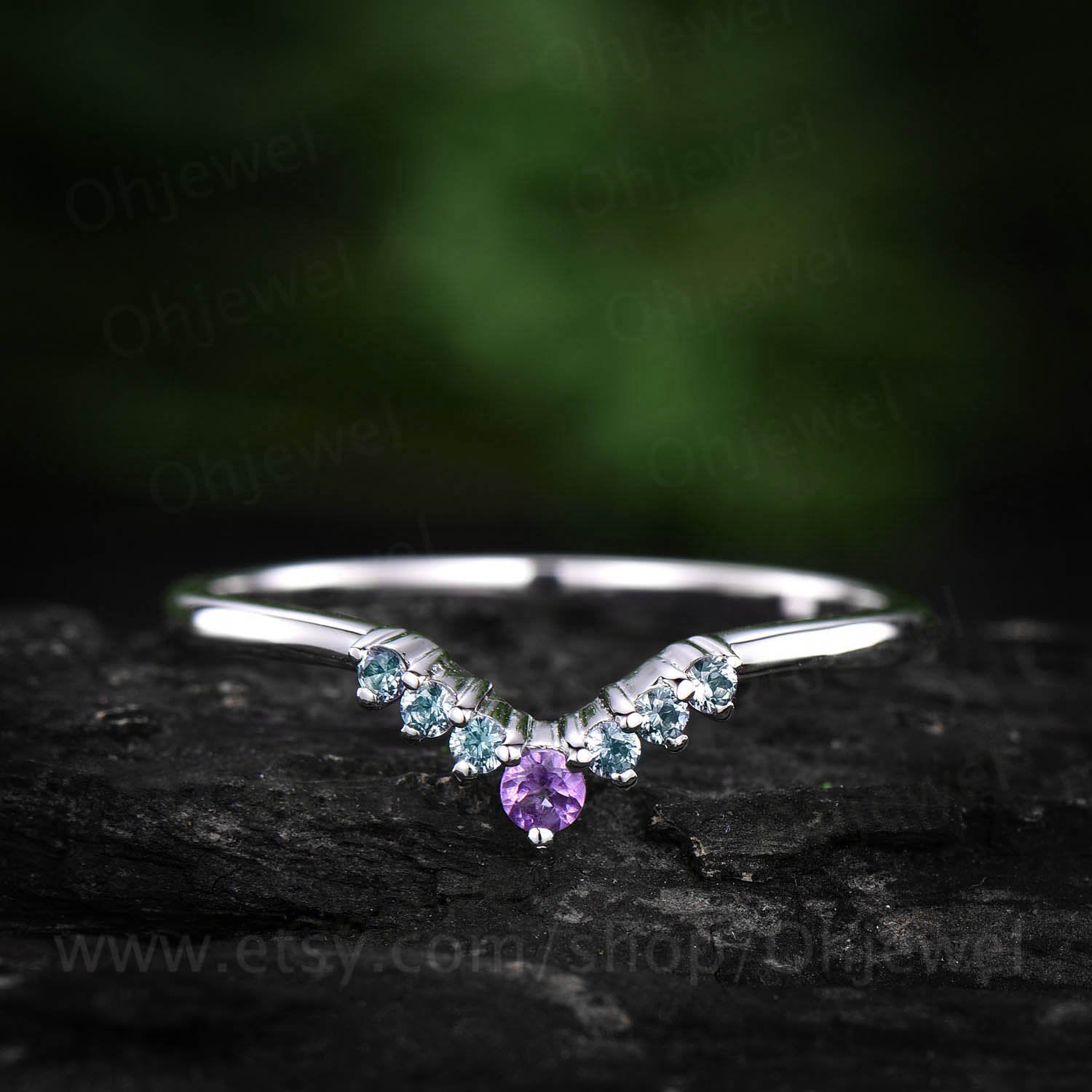 Amethyst ring Curved V Alexandrite wedding band matching stacking ring band white gold jewelry anniversary birthday gift