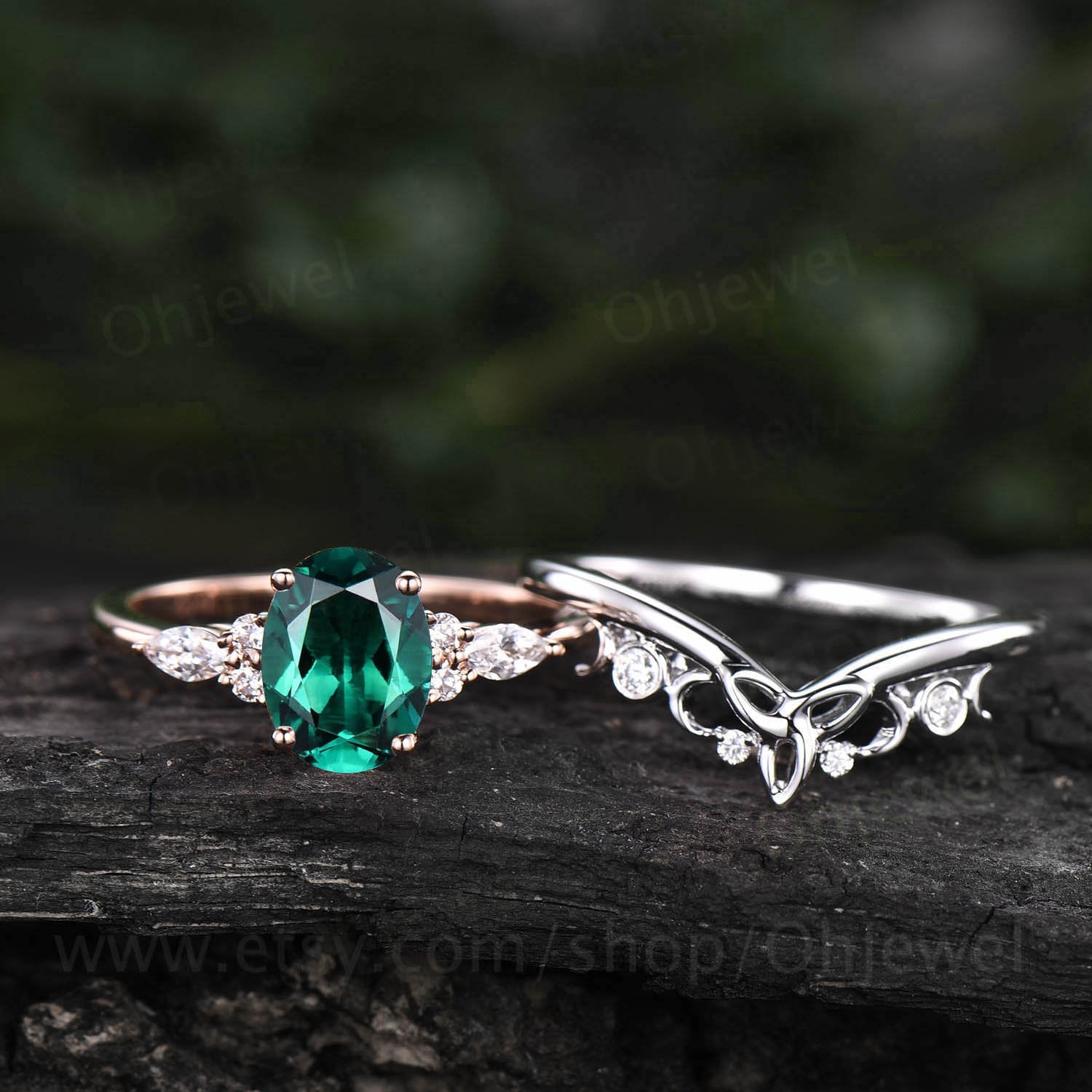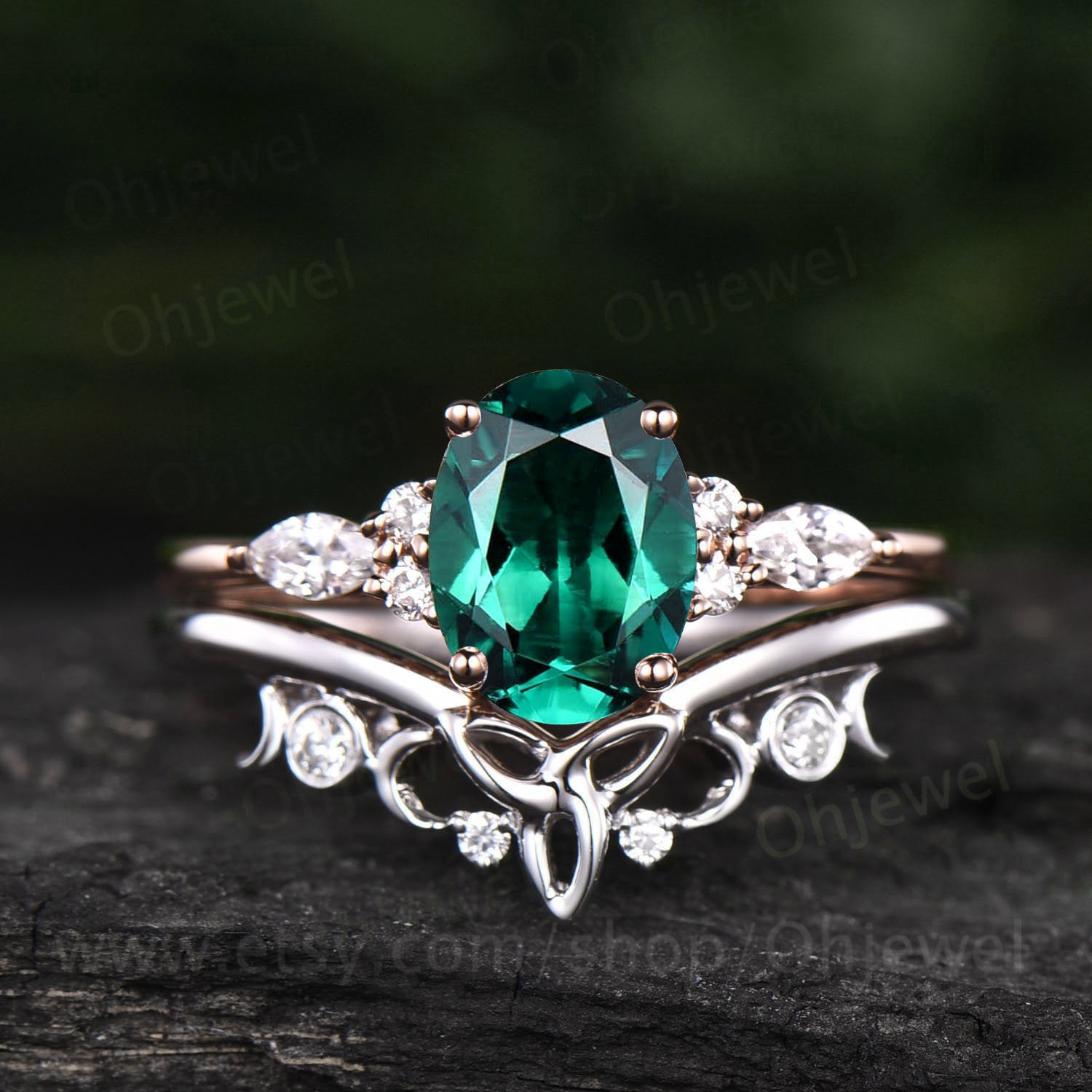Art deco emerald engagement ring set vintage rose gold silver ring women Norse viking ring moissanite wedding set oval cut bridal ring set