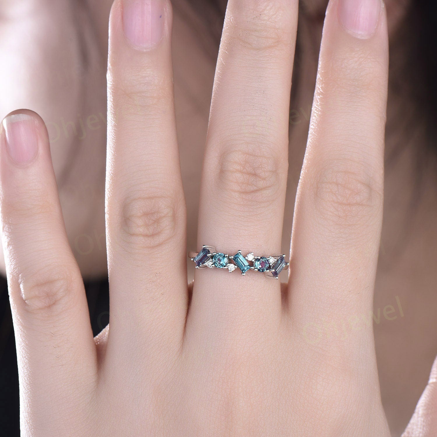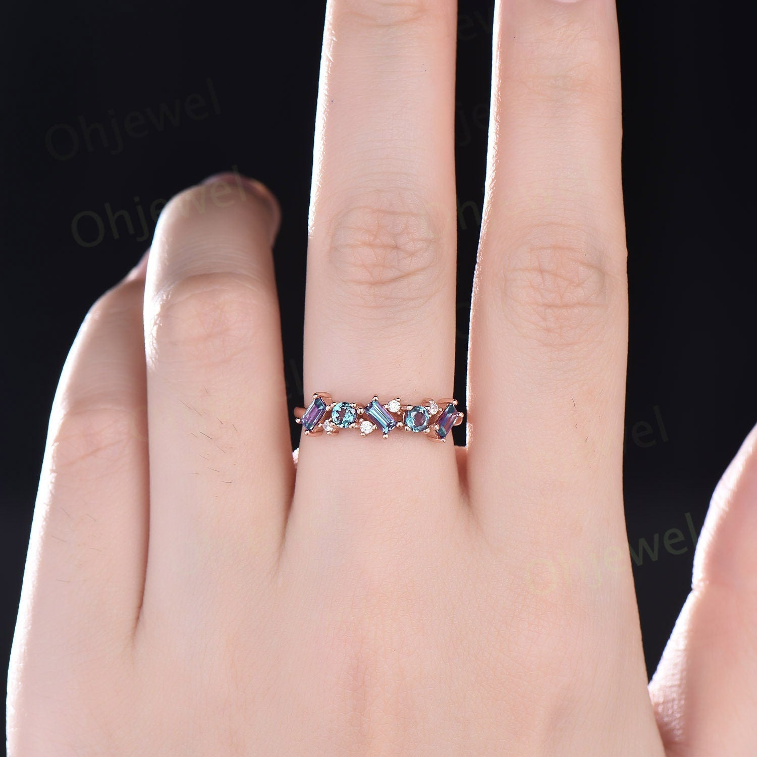 Baguette cut Alexandrite ring vintage solid 14k rose gold dainty moissanite wedding ring band women unique anniversary ring gift