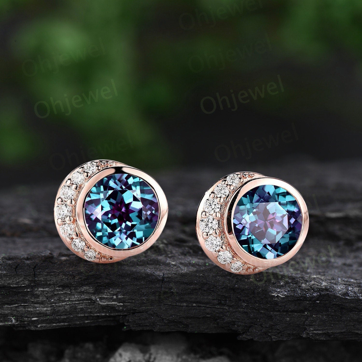 Bezel round cut Alexandrite earrings solid 14k rose gold vintage moon diamond stud earrings women dainty wedding anniversary gift