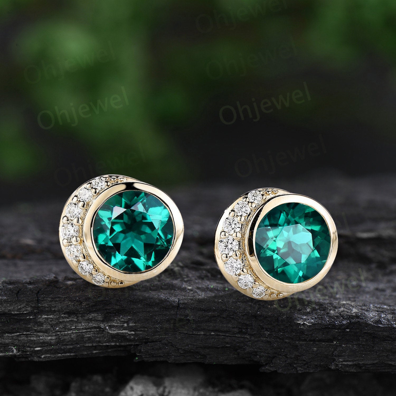 Bezel round cut green emerald earrings solid 14k yellow gold vintage moon diamond stud earrings women dainty bridal anniversary gift jewelry