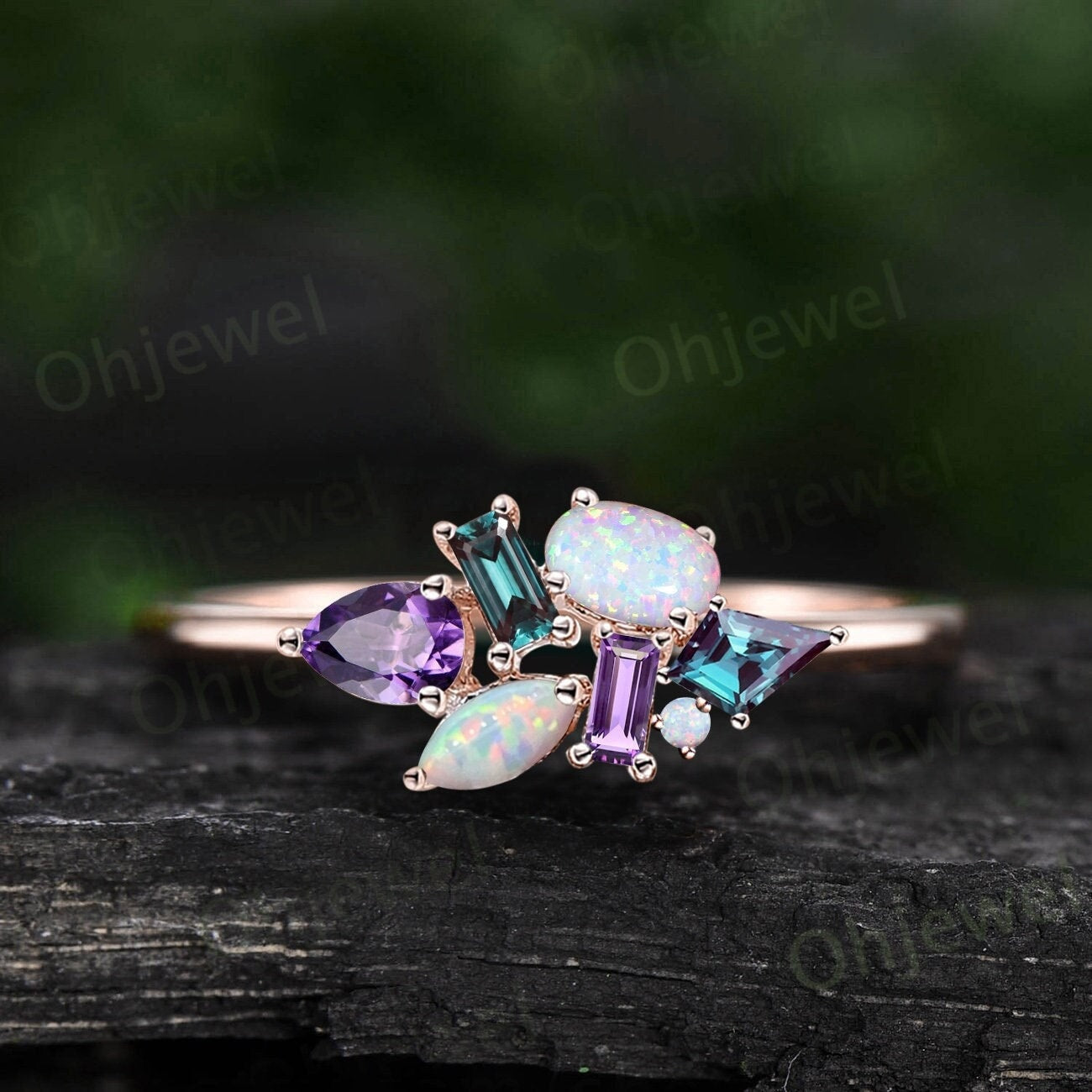 Cluster oval opal ring Personalized kite alexandrite ring rose gold pear baguette amethyst ring women dainty unique wedding ring band gift
