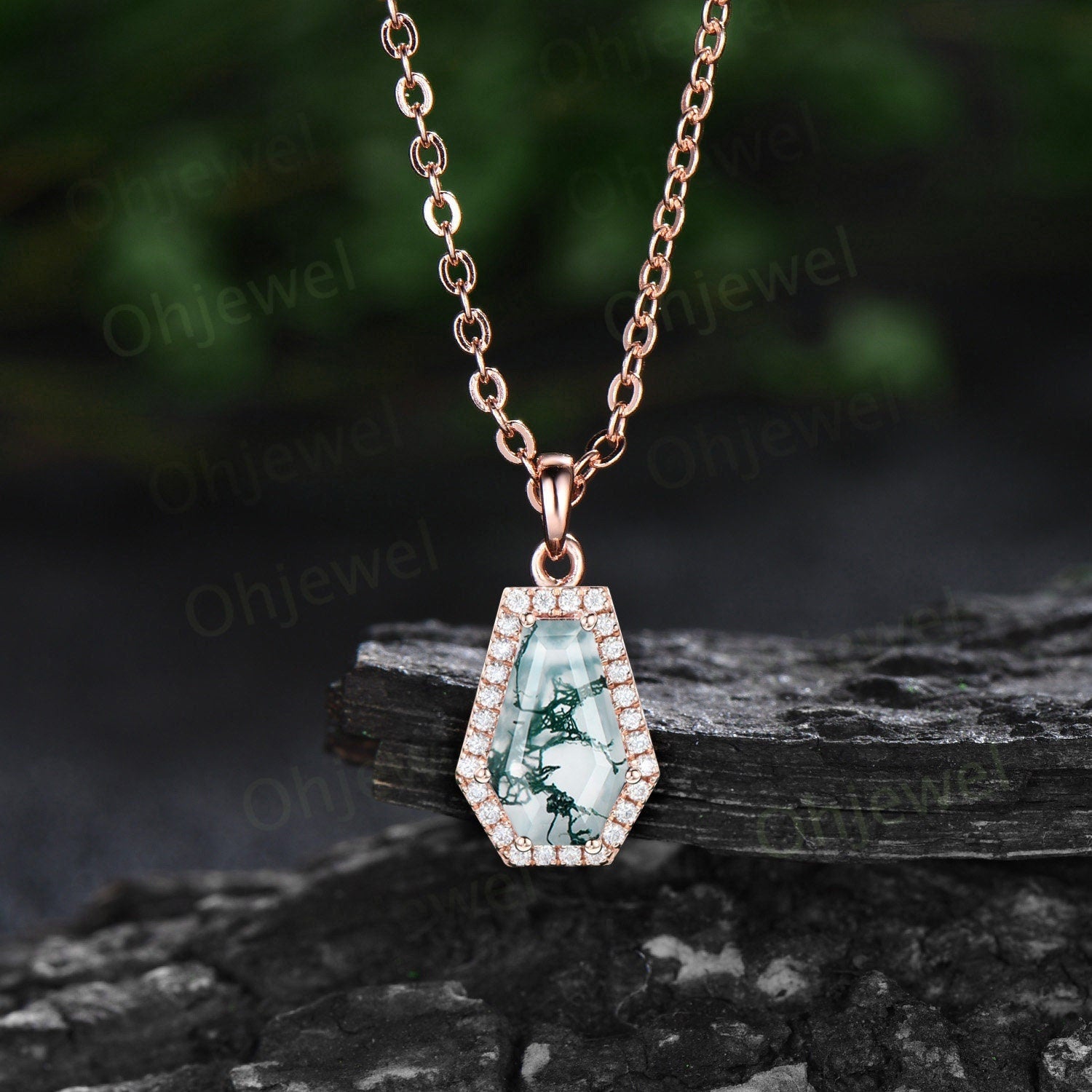 Coffin shaped natural green moss agate necklace vintage solid 14k rose gold dainty 6 prong halo diamond necklace Pendant women gift for her