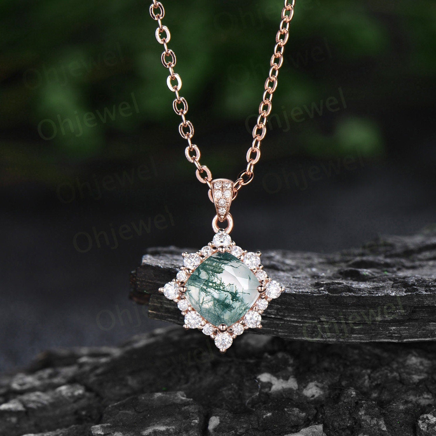 Cushion cut green moss agate necklace solid 14k yellow gold unique snowdrift halo diamond Pendant gemstone anniversary gift for women her