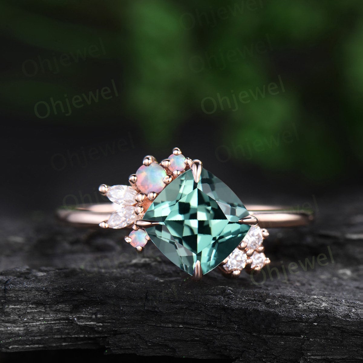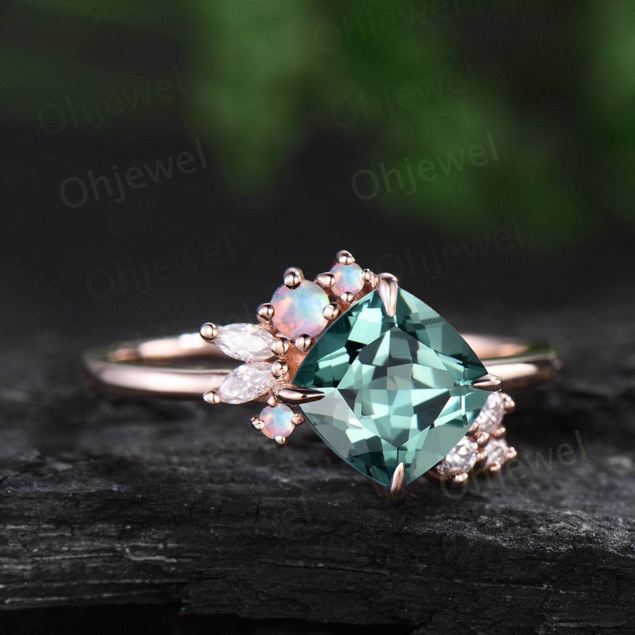 Cushion cut green sapphire engagement ring solid 14k rose gold snowdrift cluster opal ring vintage diamond anniversary ring gift for women