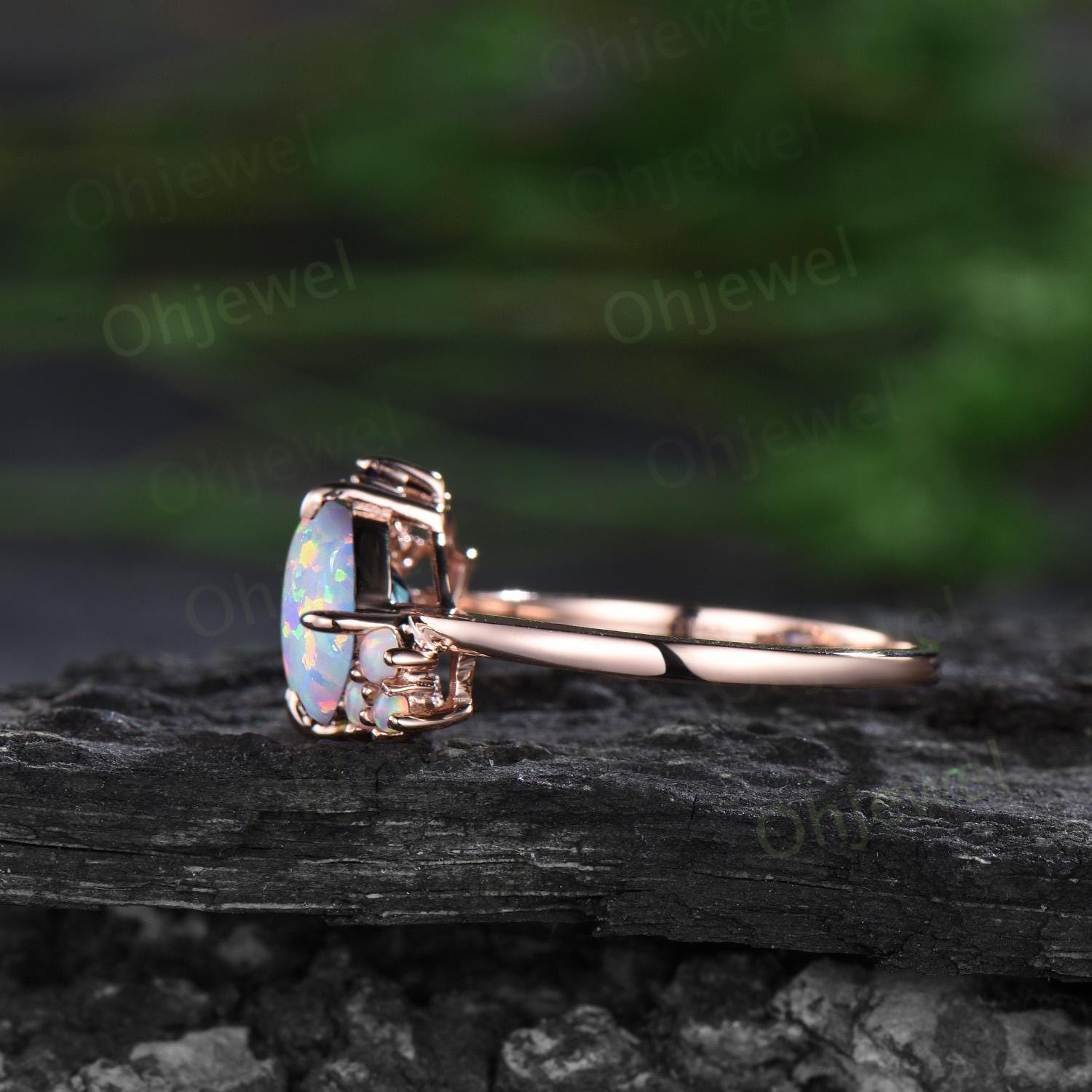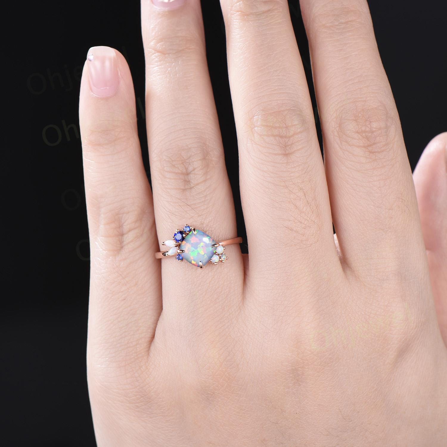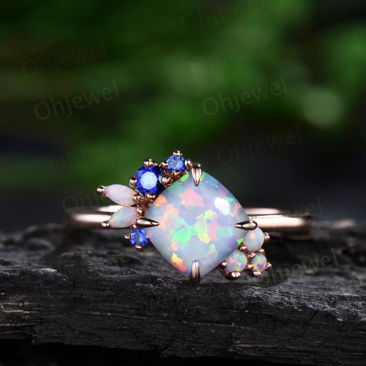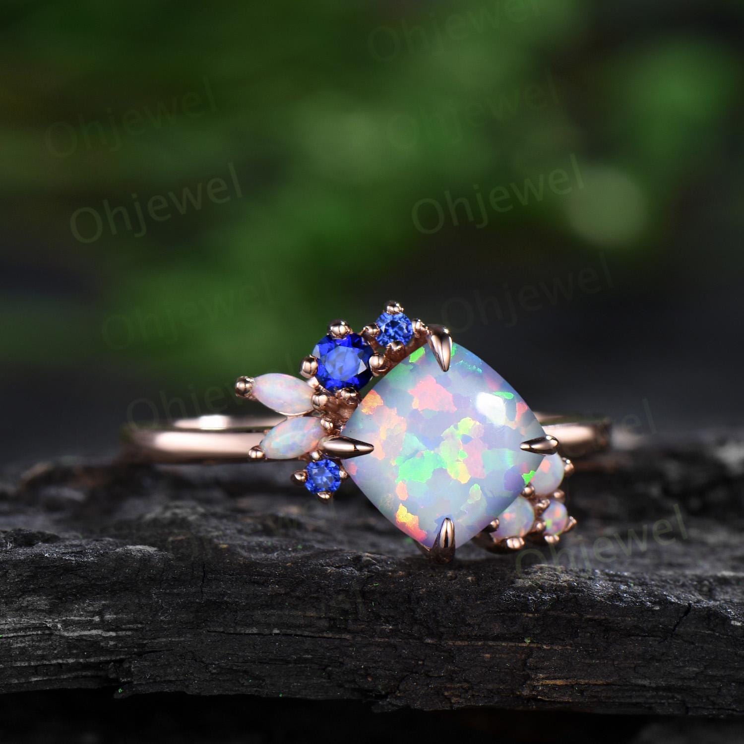 Cushion white opal ring rose gold vintage sapphire cluster unique engagement ring women square opal bridal anniversary ring gift jewelry