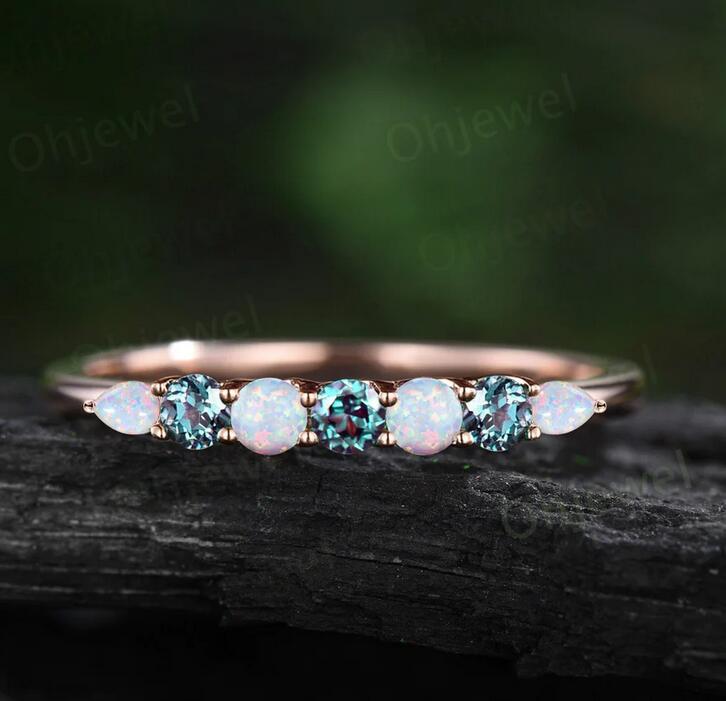 The wedding band stones are round 2.5mm lab alexandrites,pear 2x3mm lab alexandrites and round 2.5mm lab opals.