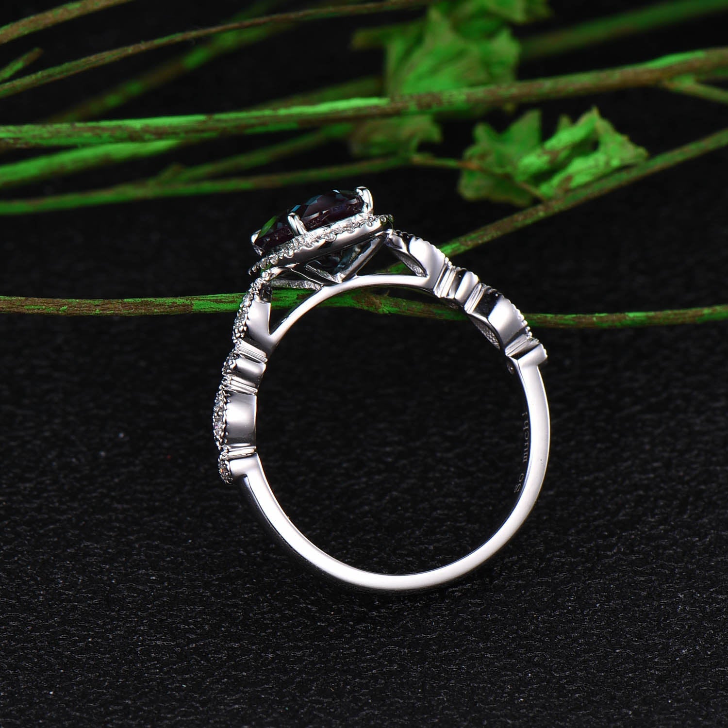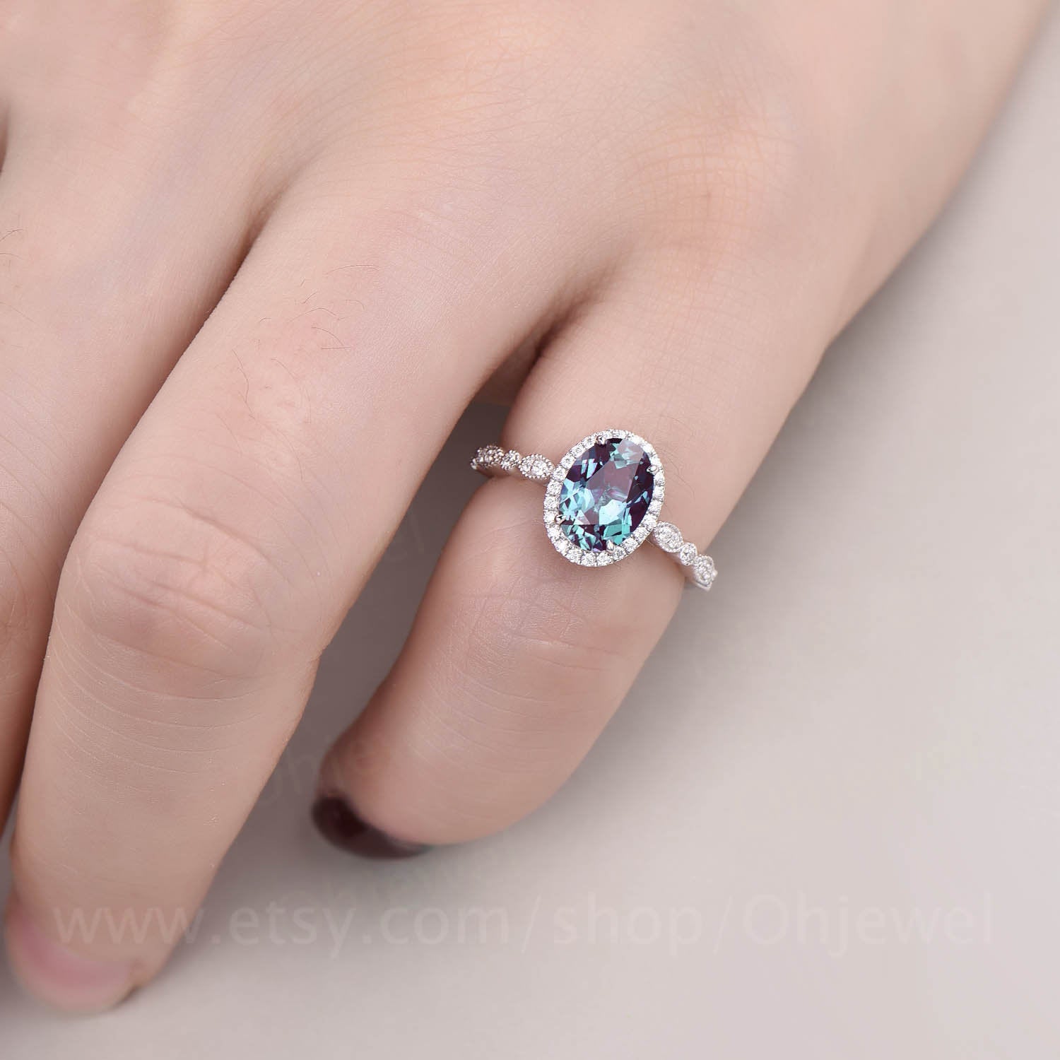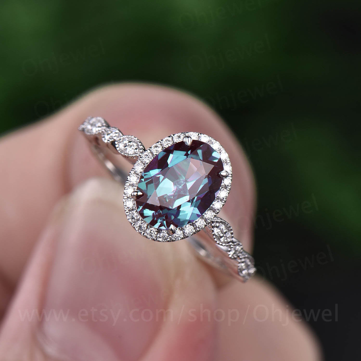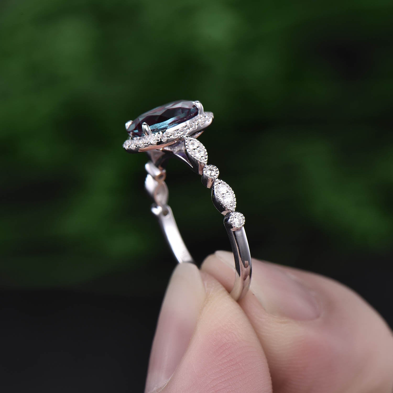 This is a 1.3 carat lab treated alexandrite engagement ring in solid gold,about 6x8mm oval cut. The accent stones are moissanites,forever classic quality.