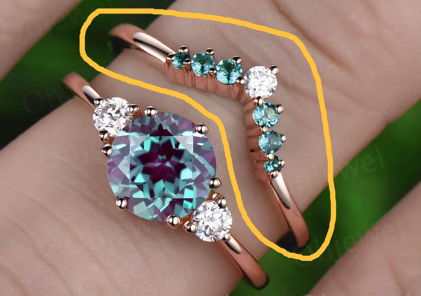 The accent stones are moissanites and 1.5mm lab treated alexandrite.