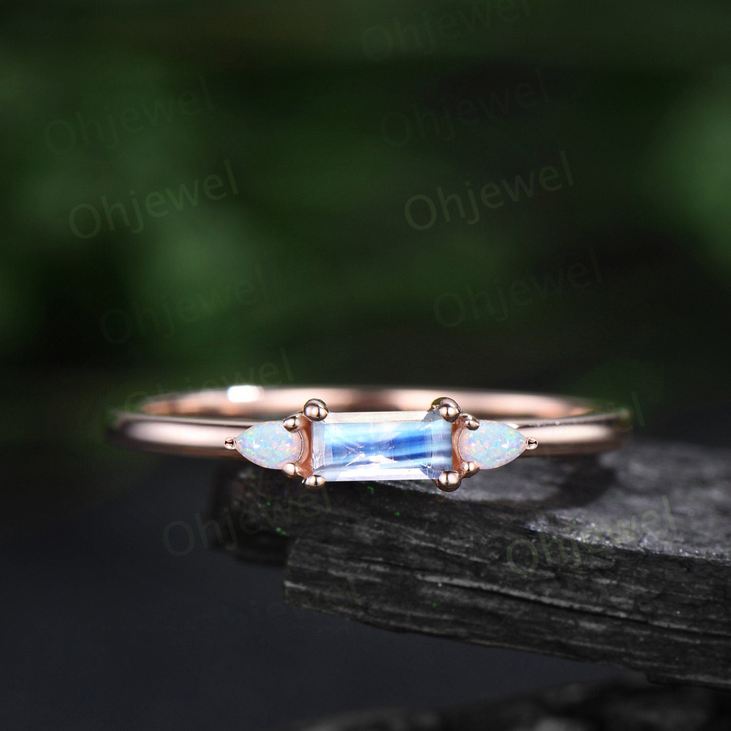 The main stones are Baguette cut 2.5x5mm natural moonstone,the side stones are pear 2x3mm lab opals.